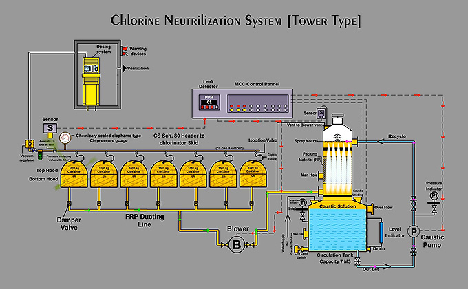 The system consists of Hoods for covering the chlorine tonner / cylinder where chlorine gas outlet valves are fitted. The storage tank are fabricated as one piece. Highly efficient centrifugal blowers of suitable size, necessary Hoods and Ductings are provided as per the number of tonner / cylinder accounted for service. Centrifugal pumps for caustic solution re- circulation is also a part of the tonner based system.